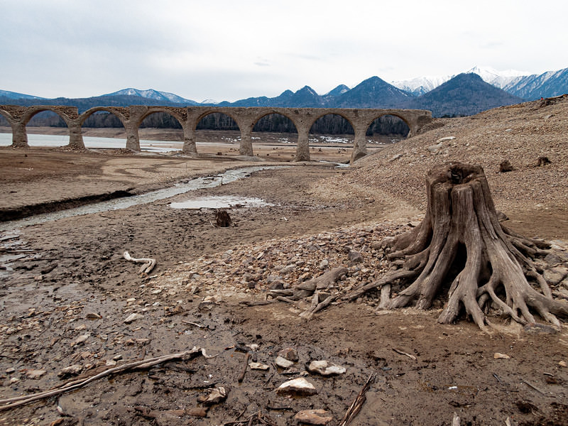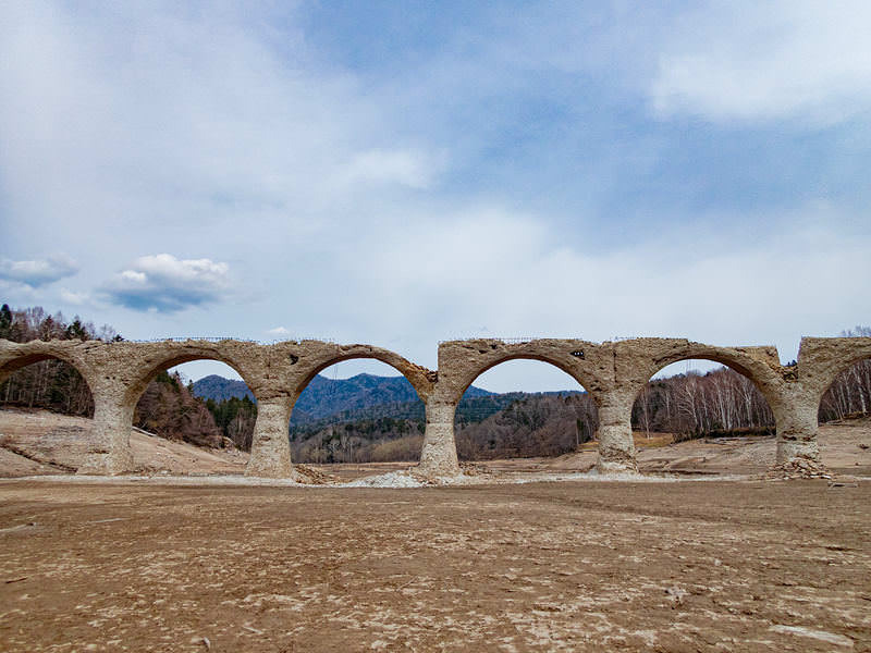糠平湖の湖底とタウシュベツ川橋梁の共演