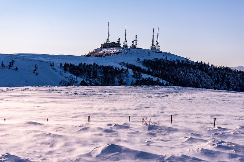 積雪の高台にそびえる電波塔