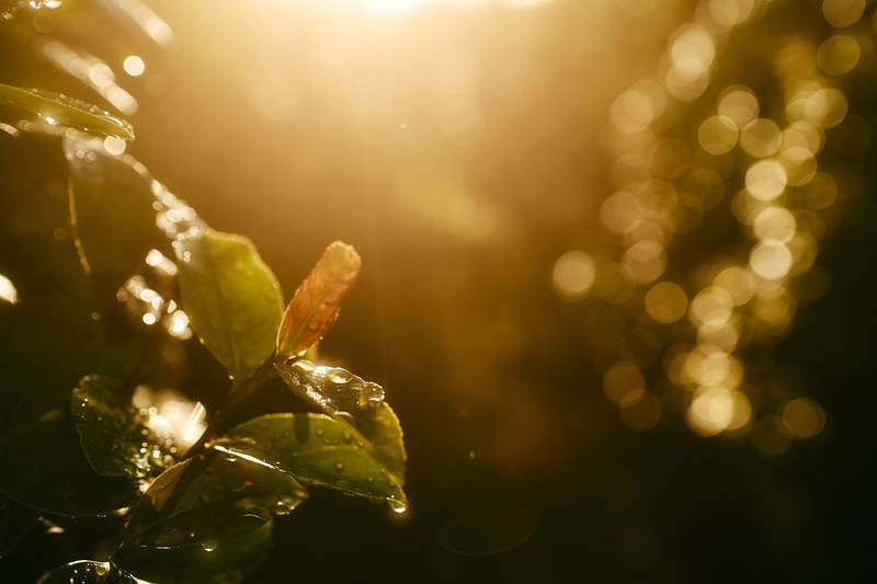 西日の中で琥珀のように輝く水滴